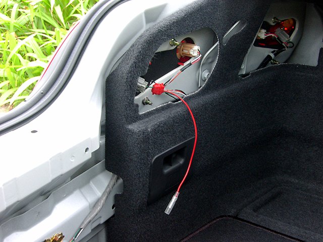 上に引き上げればはずれます。 バックランプの配線が見えたら、黒でないほうの線( 私の車の場合、緑)から、 車速パルスと同じようにして分岐コネクタで取り出します。 |