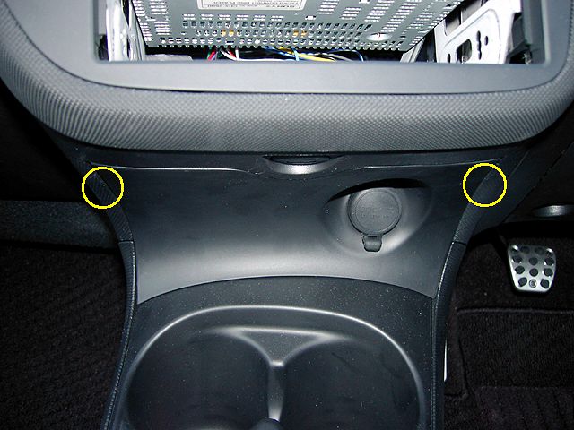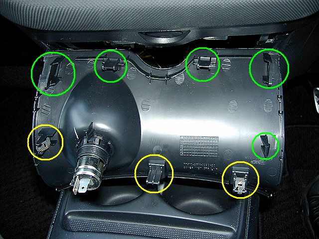 忘れないようにしましょう。私は毎回(今回も)忘れて面倒なことになります。(^^; ロアカバーは上部両側にこじるための凹みがあるので、 そこを手がかりにはずしていくのですが、裏を見てわかるとおり、 クリップやフックがたくさんあるので、ちょっと時間がかかりました。 右の画像の黄色円はクリップのはずなんですが、中央のは金具がなくなっています。アクセサリソケットのカプラはもちろんはずしておきます。 |